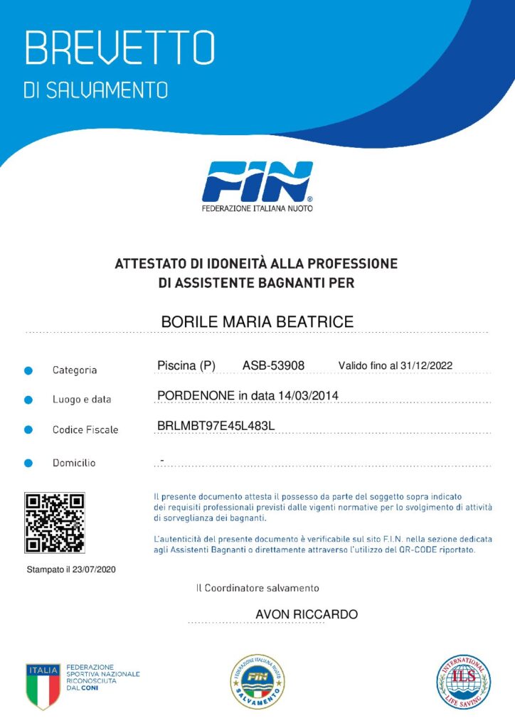 Partecipa a corsi di nuoto passando di grado in grado fino al conseguimento del brevetto di assistente bagnante nel 2013.