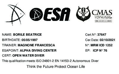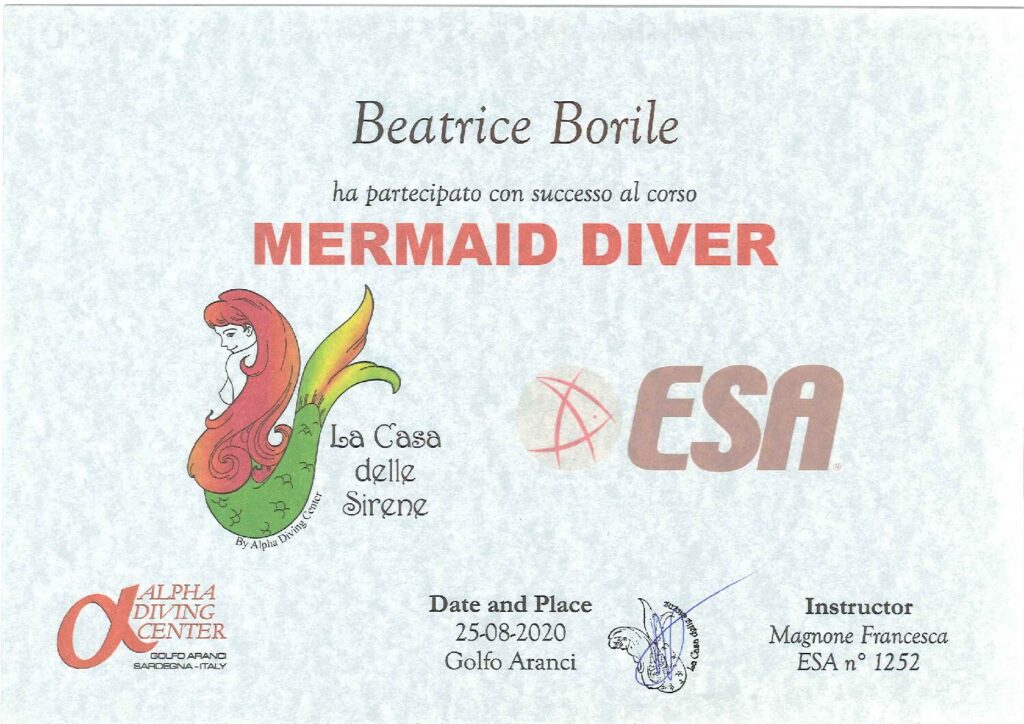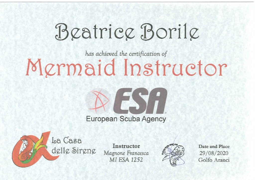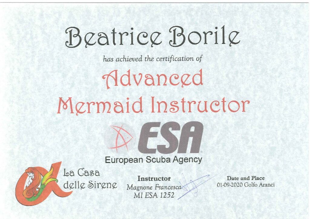 E a seguito, consegue il brevetto di ESA MERMAID INSTRUCTOR E ESA MERMAID ADVANCED INSTRUCTOR e diventa ufficialmente una sirena qualificata.