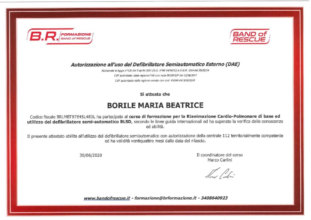 Successivamente, nel 2020 ottiene il brevetto Oxigen First Aid (autorizzazione all’uso del Defibrillatore Semiautomatico Esterno DAE)
